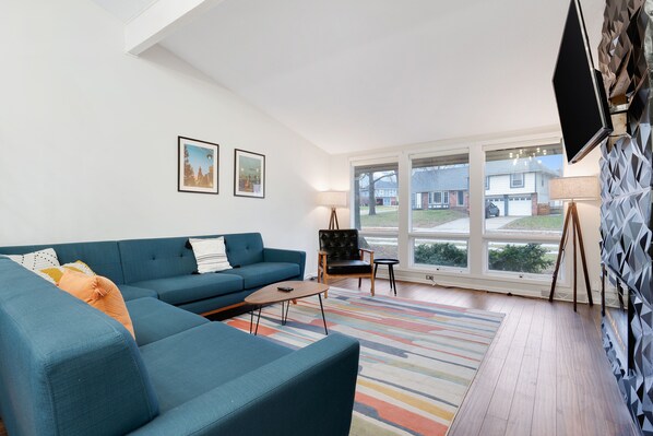 Main Living Room: Light-filled and welcoming, the main living room features a large sectional sofa, an additional armchair, a Smart TV for streaming your favorite shows, and a cozy electric fireplace — the perfect spot to relax after a day of exploring.