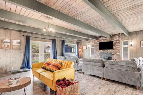 - Cozy living room with wood-burning fireplace and comfortable furniture