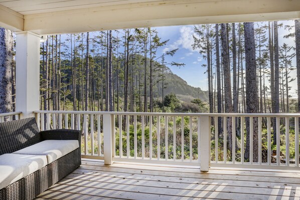 The lower level media space and double bunk room is the perfect spot for a quiet getaway or a retreat for youngsters. Sleep four happy guests in this cheerful room, with an adjacent full bathroom. Watch movies with the entire gang in the media room, with an oversized plush sectional and a large high definition flat screen tv. Step outside to the covered deck and slip into the warm soaking waters of a secluded hot tub. Listen to the sounds of the ocean, while gazing beyond the filtering of trees to a wide sandy beach.