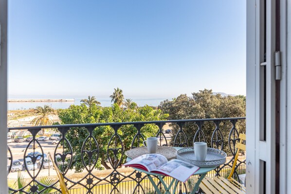 The apartment, on the second floor of a historic building with elevator, features a large and bright living area furnished with sofa, dining table and open kitchen equipped with all amenities. This area boasts a splendid view from the balcony over the green area of the Foro Italico and the waterfront. The sleeping area includes a bedroom with a queen-size bed. A bathroom with shower completes the layout.