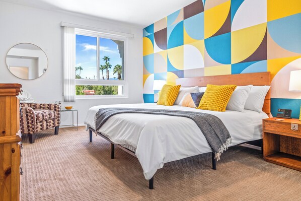 Step outside to the spacious, tiled balcony, complete with a retractable awning for shade. Whether you're sipping morning coffee or toasting the sunset with a cocktail, this serene outdoor space is the ultimate spot to soak in the beauty of Palm Springs.