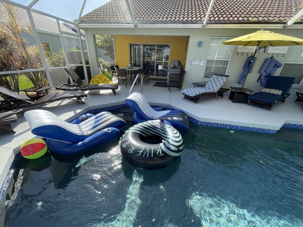 Experience the ultimate Florida getaway at this beautifully decorated home, where every detail has been thoughtfully considered. With a heated pool, WEBER grill, and stunning outdoor spaces, you'll feel right at home. Each of the three bedrooms boasts its own Smart TV with RoKu Box and comfortable memory foam toppers for a restful night's sleep.