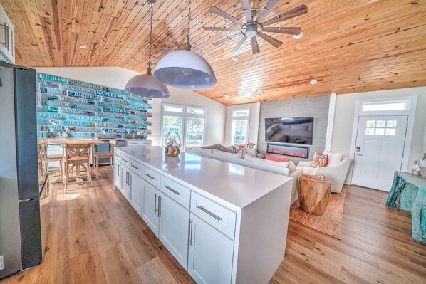 The full kitchen is stocked with everything you'll need for making tasty family meals, including stainless steel appliances, cookware, a toaster, and a Keurig Kcups coffee maker. Six people can pull up a seat at the breakfast bar and 4 more people can be seated at the dining table to enjoy meals or just hang out and relax!