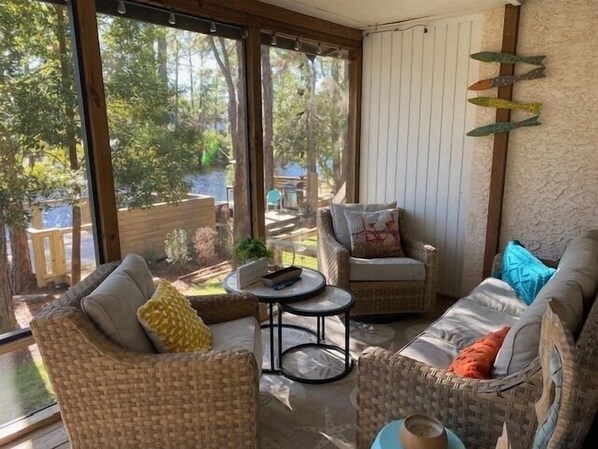 leading out to a large wraparound screened in porch with seating for 10 on our outdoor sofa and chairs
