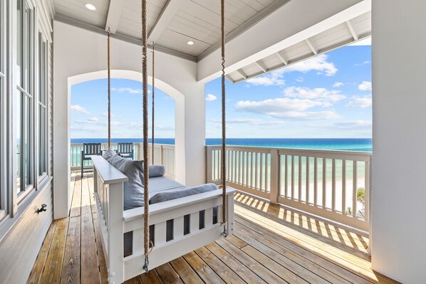 A primary bedroom on the third floor has incredible Gulf views and a private balcony. A bunk room with a twin-over-twin bed and 2 guest bedrooms are also on this floor.
