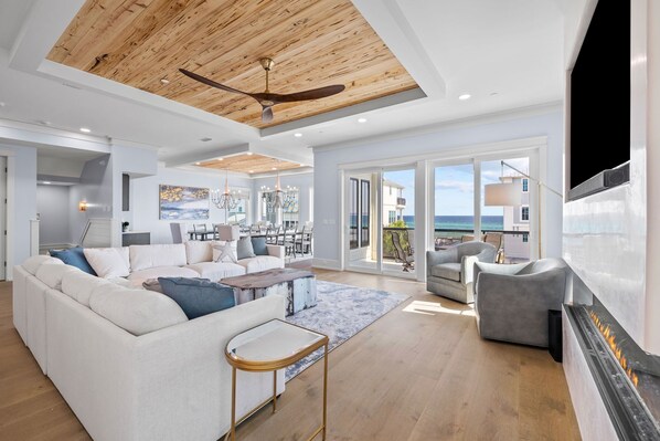 The heart of this home is the open space living, dining, and kitchen area. The living room, with its plush seating and bespoke fixtures and modern fireplace offers a seamless blend of comfort and style. Large windows frame the breathtaking Gulf views, allowing you to feel at one with the sea from the comfort of your own home. The gourmet kitchen boasting top-of-the-line appliances provides a perfect space for culinary adventures. From here, you can step out onto the covered decks on each of the three upper levels. These vantage points offer unobstructed views of the Gulf of Mexico, where you can savor the gentle sea breezes and soak in the beauty of the coastal landscape.