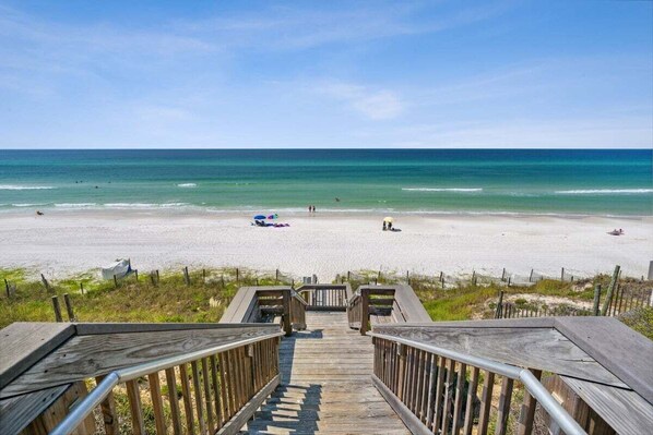 The Blue Marlin, a newly renovated condo within this gated complex, spares no expense in providing a luxurious experience. This condo, located on the second floor, allows easy access to the white sandy beach either by stairs or elevator. Its prime location near Rosemary and Alys Beaches ensures proximity to charming coffee shops and restaurants.