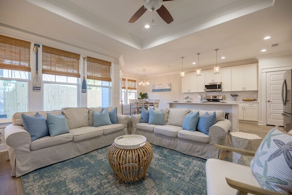 Step inside and settle into a stylish, fully stocked 4-bedroom, 2-bath retreat designed for up to 8 adults or 11 guests total, including kids. With a split floor plan, cozy furnishings, and a well-equipped kitchen, it's the perfect space to relax and create memories. We've thought of everything —including beach gear and pet essentials—so all you need to bring is your family, your pups, clothes, and food.