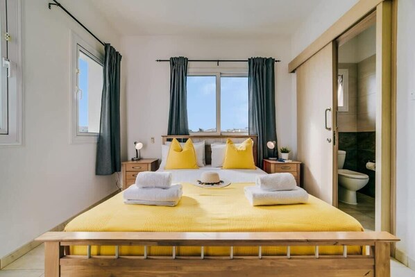Step inside this villa, and you'll find an open-plan living, dining, and kitchen area, fully equipped to cater to your every need. The kitchen features an oven, hob, extractor, fridge-freezer, toaster, kettle, dishwasher, and a washing machine. Dine indoors within the comfort of air conditioning, enjoying quality time around the dining table that seats up to 6. The spacious living area beckons with an inviting L-shaped sofa, perfect for relaxation and television enjoyment. This versatile sofa also doubles as a bed, accommodating a 5th and 6th guest for a mere €25 per person, per night. Additionally, a convenient WC is available on the ground floor. Villa Theadora has 2 splendid bedrooms and a family bathroom. The master bedroom also boasts a private ensuite and a balcony, a perfect spot for a morning coffee or a nightcap. The second bedroom is a cosy twin room with 2 single beds.