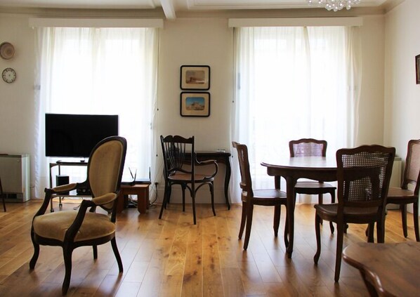 This apartment has Art Deco furniture and lighting fixtures, large living and dining-room, new oak floors, 40'’ smart TV, internet, free telephone for Europe, USA, Canada and Australia. Very effective accumulator electric heating, well appointed kitchen and bathroom. This apartment is equipped with brand new refrigerator, microwave, washing machine, clothes dryer , vacuum cleaner & dishwasher.Bed and bathroom linen.