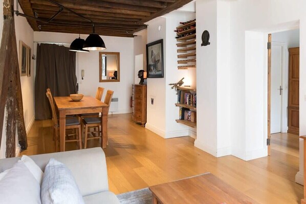 Welcome to Marais Tradition! This stunning one-bedroom apartment, spanning 548 sqft / 51 sqm, is situated in the heart of the lively Marais district. Enjoy direct access to Metro Line 1, which connects you seamlessly to the Champs-Élysées and La Défense. The area is rich in cultural, historical, and architectural heritage. You'll be just a few blocks from the Musée Picasso, the Centre Pompidou, and the beautiful Place des Vosges.