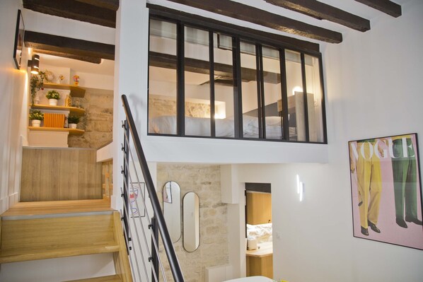 The authenticity of the area is captured in the architectural details of the apartment, such as the exposed beams and stones, and the high ceilings which enhance the space and light.