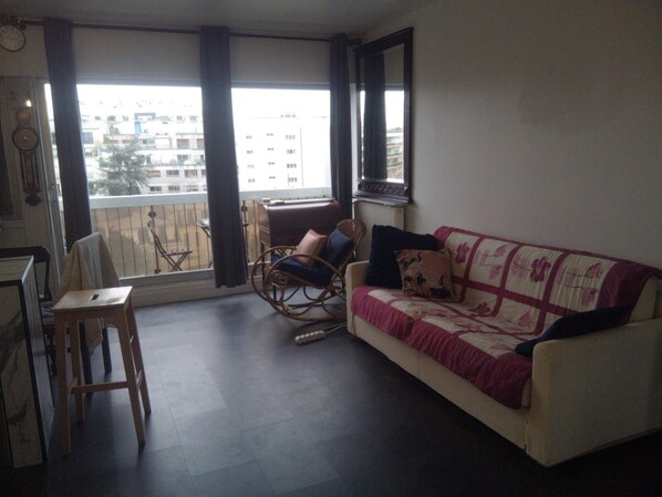 Living area - Warm and quiet studio. Terrace overlooking the Eiffel Tower. (Paris)