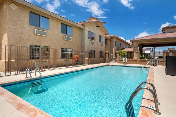 Guests start their day with a continental breakfast before heading to the business center or fitting in a workout, then relaxing by the outdoor pool
