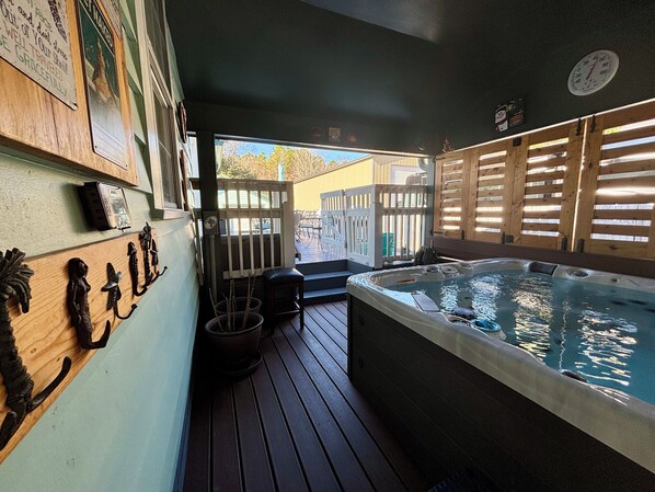 To the back yard you will find a covered patio with more seating. In the patio area you will find the axe throwing game, corn hole game set: bean bags stored in the compartment on the underside of the game, to have some outdoor play or try your skill at the ring-toss on the back porch wall, or just relax in the shade under the private porch listening to the birds sing or sitting around enjoying each other’s company. Record the memory with a selfie by the large outdoor 'Pass a Good Time' clock.