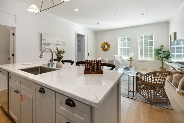 🍽️ FULLY EQUIPPED KITCHEN • Fridge, oven, microwave, dishwasher • Cookware, utensils, basic spices, coffee essentials • Island for prep, snacks, or sipping wine