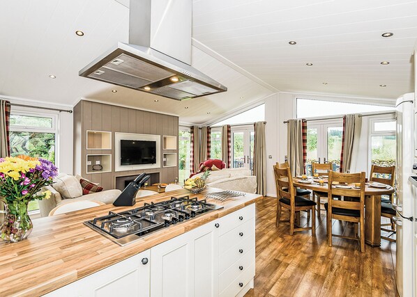 Luxurious lodge ideal for a family breakaway, with one king-size double with dressing area and featuring en suite bathroom with bath and overhead shower and one twin with en suite shower. Stylish open-plan living space features a spacious living area, modern kitchen area featuring island with breakfast bar and dining area. The patio doors lead onto the decking area, ideal for enjoying the countryside views. Pets allowed in selected accommodation only.