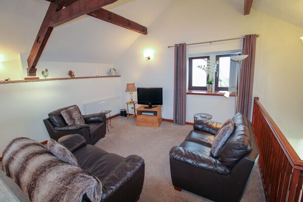 The open-plan first floor showcases a vaulted ceiling adorned with beams. Cosy leather sofas are strategically placed around a Freeview TV, ensuring you won't miss your favourite shows. The kitchen area is equipped to help you prepare meals with an electric cooker, fridge, and microwave. Enjoy lingering over your morning cup of tea at the dining table while planning your day's adventures.