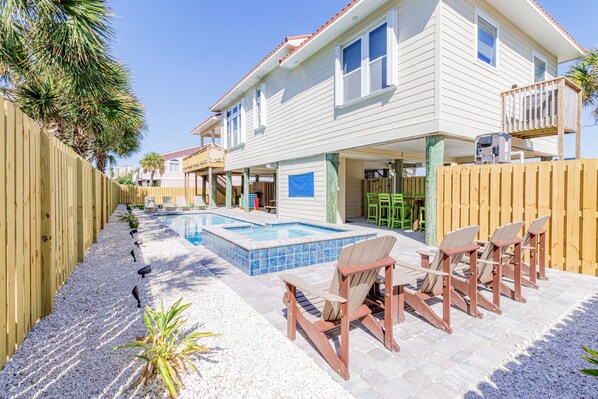 Escape to a beachside retreat on Maldonado Drive, just two blocks from the Gulf. Unwind in the private pool and hot tub under starry night lights or stroll down the sidewalk to reach pristine shores in 3-5 minutes.
