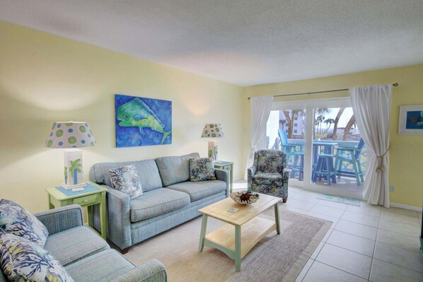 Sunshine, Sea Breezes, and Sparkling Emerald Waters, all come with this beautifully updated condominium. You will love the tastefully chosen artwork that helps with the coastal ambiance! This one has everything you need to enjoy your vacation. The kitchen is fully furnished (including large electric griddle, crock pot, Keurig coffee maker and standard coffee maker) and has a full size refrigerator so you can dine in. You will enjoy eating meals on the balcony in the comfort of high end furniture overlooking well-manicured grounds and ocean views. The spacious living room has a large flat screen "smart" TV with comfortable seating for six and a hide a bed. The master bedroom has a queen size bed, flat screen TV, and private access to the bath with double sinks. The guest bedroom has a queen size bed. This unit features tile floors through out for a very clean feel. Conveniently located near both pools, one that is heated year-round. Free Wi-Fi in unit. Come enjoy a relaxing vacation at El Matador #126!