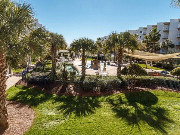 C300 at Waterscape Resort on Okaloosa Island offers the perfect coastal retreat with 3 resort pools, including a zero-entry pool and a toddler splash pad. Enjoy ocean views from this spacious condo, beautifully decorated with an interior facing view of the Splash Pad pool area.
