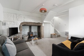 Through the front door you enter the living room, which centres around the Inglenook fireplace and wood burner (In season we will leave you enough logs to get you going for a night or two) and has a two-seater and a three-seater sofa and a Smart TV, perfect for movie nights in with the fire blazing. A dining area with comfortable space for four leads out through French doors to the garden. Stairs lead up to the bedrooms and an open doorway flows through to the kitchen.