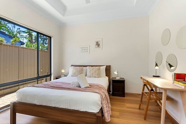 - The first bedroom, located towards the front of the property, offers a view out to the side of the property. It features a stylish queen bed frame with a comfortable mattress, bedside tables, and lamps on either side for your convenience. Additionally, a study desk with a chair and lamp is available, providing a comfortable space for work or study during your stay. There`s a walk-in wardrobe with hanging space and a chest of drawers, perfect for hanging your clothes and storing other personal belongings.