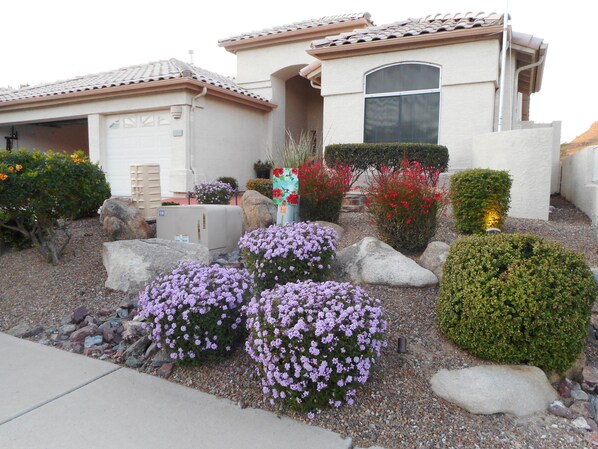 This is a split floor plan with 2nd bedroom and bath. The back yard has been professionally landscaped and includes a spa and BBQ. Two garage stalls are available for your use. Two sets of golf clubs available for guests to enjoy.