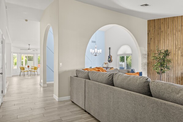 The main living room was designed for comfortability. With a big comfy sectional, additional seating, a big smart TV, and sleek, modern design throughout, this space is ideal for gathering around with your family and friends for movie nights & watching the big games!