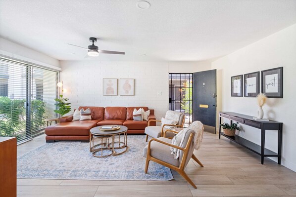 Welcome to Palm Sunrise! Located just a 5-minute stroll from two Scottsdale Trolley stops, you're steps away from vibrant coffee shops, the scenic Waterfront, captivating art galleries, wine tasting rooms, and Old Town nightclubs. A perfect blend of comfort and convenience. Nestled in a quiet condo community. Perfect for families with kids, and small groups. Enjoy our pool, cable TV, outdoor grill, and palm tree views. Our condo is thoughtfully furnished with contemporary artwork for a cozy stay.