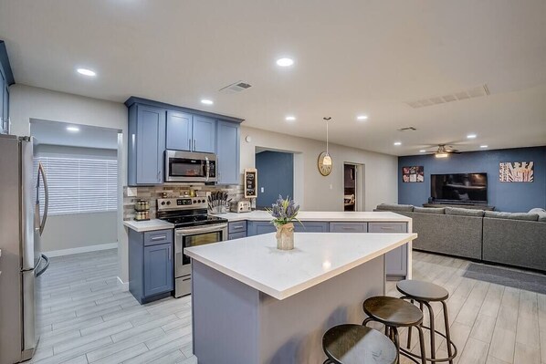 4 bedroom and 3 bathroom home w/ brand new heated pool, grill, fire pit, turf, living room, bonus room with fireplace etc. Enjoy sitting outside in the sun in your private getaway, ideally located in Arizona!