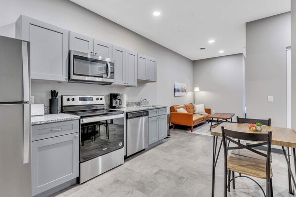 Our spacious one bedroom apartment features inviting living areas, fully-equipped kitchens, and bathrooms complete with toiletries. Throughout your stay, enjoy access to the building's fitness center with strength and cardio rooms.