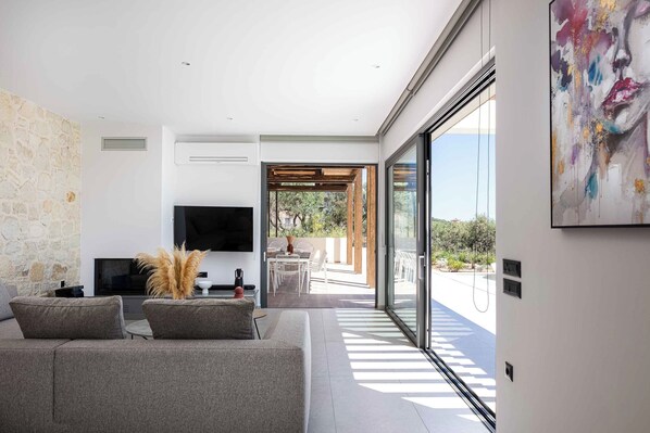 Living area with sofa, 55 Smart TV, fireplace, access to the pool terrace, sea view