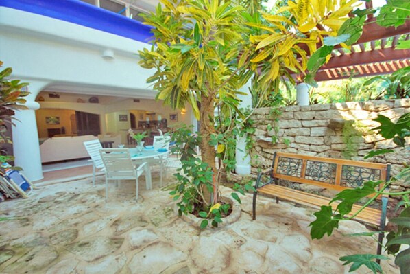 In the heart of Playa del Carmen, this beautiful 2-bedroom condo offers a serene retreat. With a fully-equipped kitchen and spacious terrace overlooking the pool and lush tropical gardens, you'll feel at home in this lovely ground-level abode.