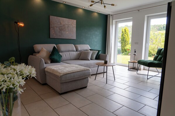 Our modern 65 m² holiday apartment in a sunny woodland edge location was completely redesigned in June 2025 and furnished with great attention to detail. It accommodates 3 adults and 1 child. Floor-to-ceiling windows offer a fantastic view of the valley – directly from the sofa or bed.