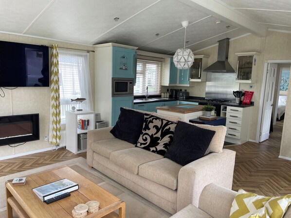 TV, fireplace - Buttercup Lodge, stunning pet-free Lodge on Rockley Park, Poole Harbour, Dorset. (Poole)