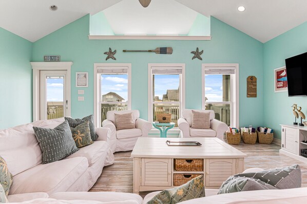 The upscale & coastal interior was thoughtfully created to provide the ultimate beach escape with the amenities of home. Start your day off enjoying your cup of coffee at sunrise on the ocean view front deck and create memorable family moments and close your day out with a drink and outdoor dining.