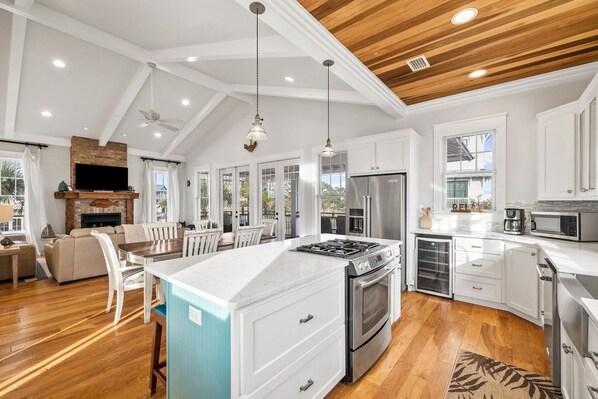 This stunning 2-story coastal retreat welcomes guests into the heart and soul of this home on the second floor. An expansive great room with soaring cathedral ceilings and gleaming hardwood floors creates the perfect space for hosting friends and family on vacation. The open living area is relaxing with plush furniture in front of a cozy fireplace and a 55†TV. The designer coastal kitchen is equipped with high-end appliances, pristine white cabinetry, and a kitchen island that adds a delightful pop of blue to the room. Enjoy a sit-down dinner with loved ones in the traditional dining area with seating for 6, or pop over to the 4-stool breakfast bar for a quick snack or casual lunch. The great room opens to an oversized balcony with 2 outdoor armchairs and an alfresco dining table for 6—not to mention wonderful neighborhood views. After a long day at the beach, 1 gorgeous primary bedroom with a king bed, sitting area, and private balcony is available on this floor. There’s also a washer and dryer to keep beach gear fresh.