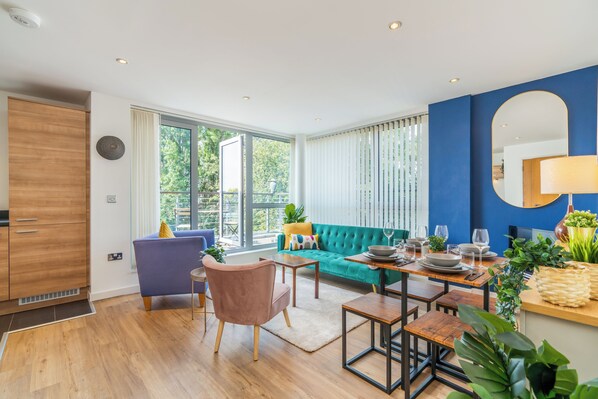 In the heart of Portsmouth's city center, this spacious 2-bedroom apartment offers a tranquil retreat for up to 5 guests. Unwind in the inviting living room with a cozy sofa bed, relax in one of two generously sized bedrooms with an en-suite bathroom each, or cook your favorite meals in the fully equipped kitchen.