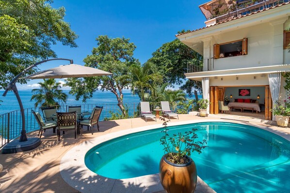 Located on the prestigious South Shore of Puerto Vallarta, Villa Padre offers a tranquil oceanfront setting. With 7 bedrooms and a full staff, you'll unwind in style by the swimming pool or rejuvenate at the spa. Savor cocktails at the outdoor bar or take in breathtaking views from many vantage points.