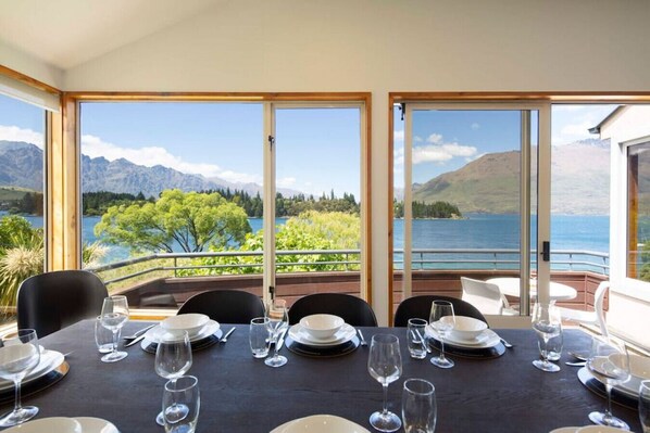 KITCHEN & DINING: The kitchen and dining are both functional and offer breathtaking views. Enjoy a picturesque lake view from the well-equipped kitchen with gas cooktop and the all-important Nespresso coffee machine. The adjacent dining area seats eight and again has the most fabulous views of The Remarkables mountain range. Step out from the dining area onto the front balcony where you can savor your morning coffee amidst incredible scenery. Additionally, there`s a cozy nook alongside the kitchen, furnished with a desk, providing a perfect spot for remote work if needed.