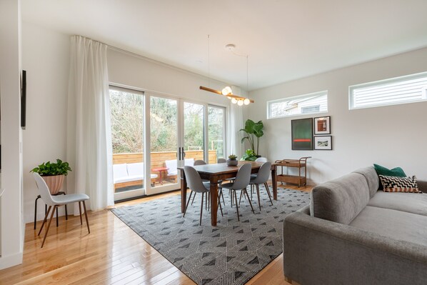 Experience the essence of Tina Turner at Hazel Modernist 6, a glamorous downtown escape designed by Alicia Hylton-Daniel. Savor time in the fully equipped chef's kitchen, unwind by the fireplace with a Frame TV nearby, or retreat to your private back deck.