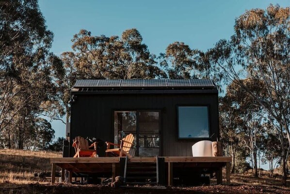 We provide bedding, linen, and towels, USB charger, fridge, fresh water for drinking, hot shower, eco-friendly compost toilet, fan, stove, BBQ, fire pit, outdoor stove, cutlery and plates, outdoor seating, books, games, and provisions (soap, shampoo, conditioner, salt, pepper, coffee, sugar, matches, and oil). You only need to bring food and drinks. Our tiny houses are powered by the sun and gas bottles. There are normal 240-volt power points in this house, but please don't try to charge large devices.