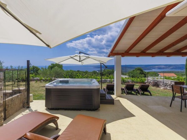 Semi-detached house "Di Nelo". In the hamlet Brovinje 15 km from the centre of Labin, in an elevated position, 3 km from the sea, 3 km from the beach, in a cul-de-sac. Private: property 1'000 m2 (fenced), garden with lawn. Outdoor shower, hot tub, terrace (45 m2), garden furniture, barbecue. In the house: internet access, washing machine. Parking (for 3 cars) at the house on the premises. Shop 2 km, restaurant 2 km, bus stop 17 km, pebble beach 3 km, rocky beach 3 km. Surf school 10 km, tennis 18 km, walking paths from the house 50 m, cycle lane 100 m.