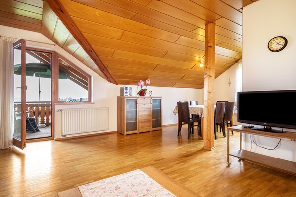 The vacation home of the Upper Swabian farm Ambs in Gornhofen is a place in a quiet, idyllic location with panoramic views of Lake Constance and the Alps, nestled on the hillside in green spaces and orchards. In the 85 m² bright vacation apartment on the 1st floor you will find a living area and a new kitchen with dishwasher, as well as 2 bedrooms (one with 2 single beds, the other with a double bed) and a daylight bathroom with shower and bathtub and a separate toilet. The apartment can accommodate a total of 4 people. Further equipment includes free Wi-Fi, satellite TV and radio. For the smaller children a baby crib and a high chair are provided free of charge on request. The private terrace with its comfortable garden furniture and parasol invites you to enjoy a hearty breakfast in the morning. In the entrance area there is a game box, which can be used by all guests. Enjoy carefree hours in the spacious garden, which you share with other guests, for example, barbecue while the children have fun on the large playground. The playground directly at the vacation home has a seesaw, slide, swing, sandbox, climbing house, trampoline, ropeway, slackline and a soccer goal. In addition, there are also outdoor toys and our fleet of vehicles for younger and older children to use on the farm, approx. 150 metres from the holiday home (e.g. scooters, tricycles, balance bikes, tractors, go-karts).