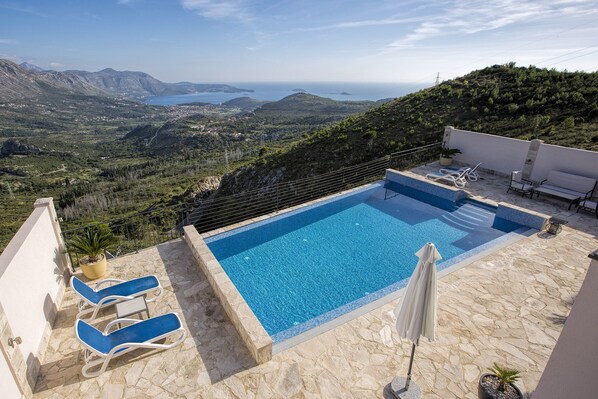 Relaxing on the large terrace by the infinity pool won’t be difficult! Sun-loungers, tables and a sun- umbrella are provided for your comfort. The outdoor lounge area is ideal for pre-dinner drinks, coffee and games. A stone BBQ is provided for you to cook and dine Alfresco by the pool whilst taking in the spectacular views.