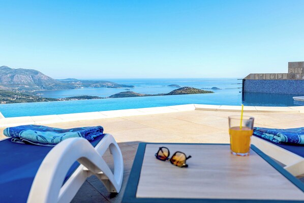 Beautiful mountain and sea views are best enjoyed from the impressive infinity pool (9mx4m) or Jacuzzi and extensive terraces with an area to BBQ, dine Alfresco or to relax on the sun loungers and outdoor sofas. Pool heating is included in the cooler months but in July and August it can be offered at £15 per day. The Jacuzzi is heated all year round to the temperature required for your comfort. Please note the pool will not be filled from end of November until beginning of April, as it is not possible to heat in the winter months unless requested.