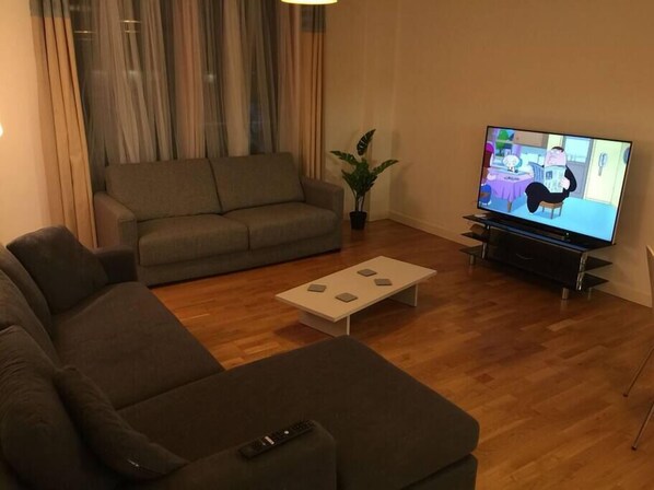 Spacious living area, 55 inch Smart TV with free access to Netflix and unlimited fast Hyper Optic broadband. Fully equipped kitchen, double bed + additional quality queen Intex raised airbed which inflates and deflates in minutes to accommodate up to 4 people in this apartment. Linens and Towels provided. Weekly clean.