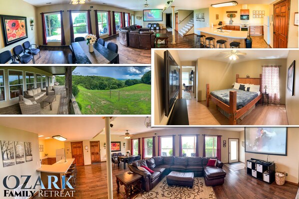 Minutes from Branson, Ozark Family Retreat and Tree-house offers a cozy getaway with a game room. Enjoy stunning Ozark mountain views, WiFi, and complimentary coffee while relaxing among acres of wildlife and flowering plants.