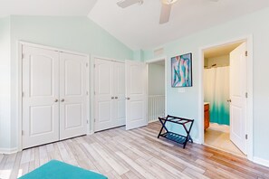 Follow the townhome's playful dog theme into each bedroom, where you'll discover high-quality linens, ceiling fans, and ample storage space. With perks like a private washer/dryer, central air-conditioning, and streaming, all your needs are met!